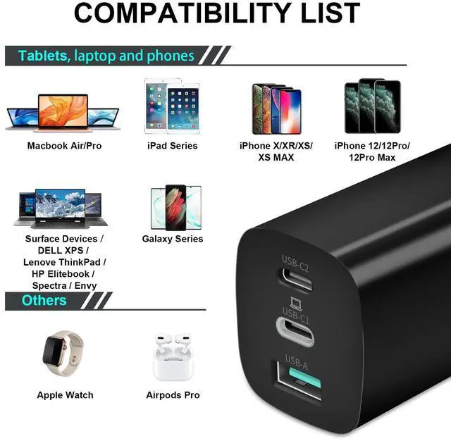 Multi-Protocol Support USB-C1 support PD 3.0 PD 2.0, USB-C2 support PD 3.0 PD 2.0 PPS (Due to compatibility considerations, only USB-C2 supports PPS 3.3V -11V=5A). USB-A port surpport QC 3.0 QC 2.0 SCP FCP AFC etc. This charger is compatible with most USB-C phones, tablets, laptops. Like Samsung Galaxy Series, iPhone Series, Pixel Series etc, Surface Series, Macbook Series, iPad Series.