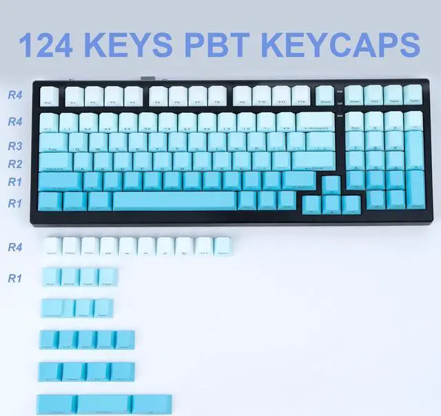 4. AdaptableThe keycaps have 124 keys in total, suitable for 61/64/68/78/84/87/96/980/104/108 and other various matching columns.