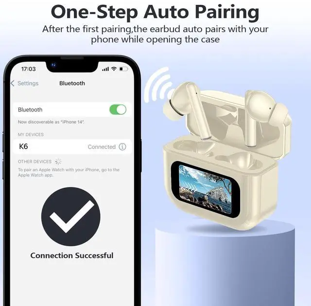 kurdene K6 Wireless Earbuds Bluetooth 5.3 in Ear Light-Weight Headphones, LED Full Color Touchscreen, Built-in Microphone Headset,Immersive Premium Sound with Deep Bass for Sport -Skin