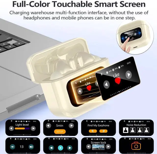 LED Full Color TouchscreenFull-color touchscreen smart noise-canceling true wireless earbuds. The charging case displays battery levels, controls music playback, manages noise cancellation, locates left and right earbuds, takes photos, and switches EQ settings. Both earbuds feature touch control for seamless call answering and music playback, giving you freedom and convenience.