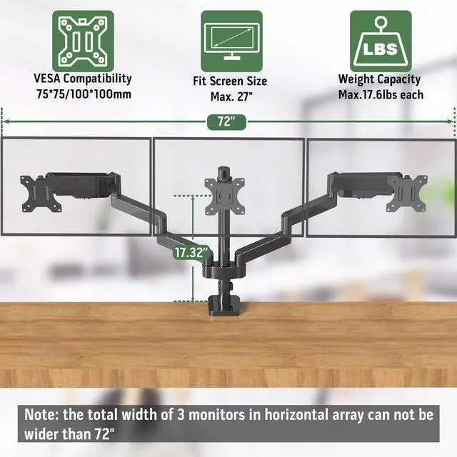 Universal Compatibility: UPGRAVITY triple monitor mount fits most flat or curved PC monitor brands with screen size of 17 18 19 20 21 22 23 24 25 26 27 inch. It is compatible with VESA pattern 75 x 75mm and 100 x 100mm. Please note: if there are no VESA holes in the back of your monitor, a VESA adapter is needed