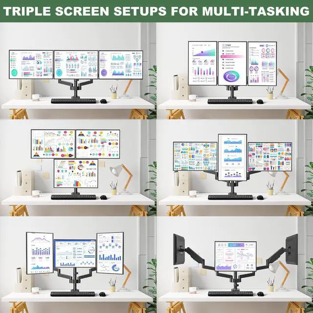 Built to Last: Constructed of high-grade steel, our 3 monitor desk mount features premium gas spring system - after over 25,000 exercise tests - bearing a max weight capacity of 17.6 pounds, which is strong enough to hold three screens securely. Enjoy a comfortable peripheral view with full motion compression arms that support -45° to +90°tilt, 180°swivel, 360°rotation and height adjustment. Freely set your monitors to landscape or portrait mode