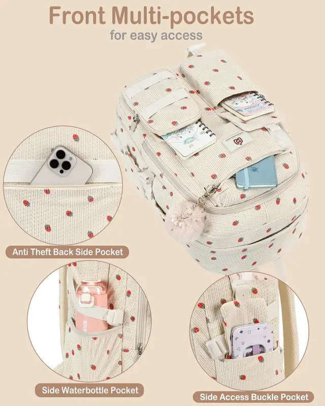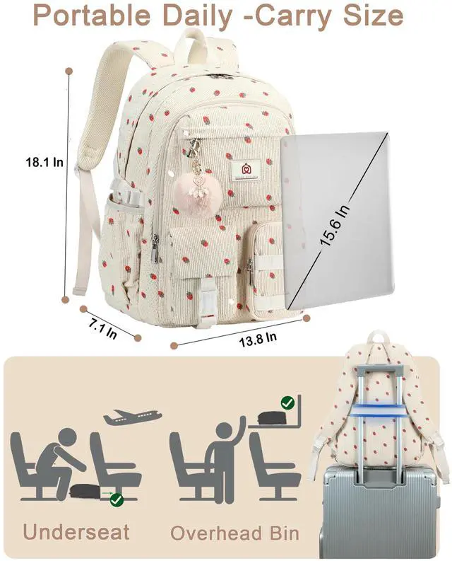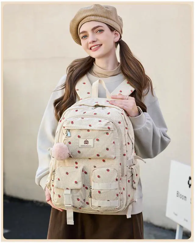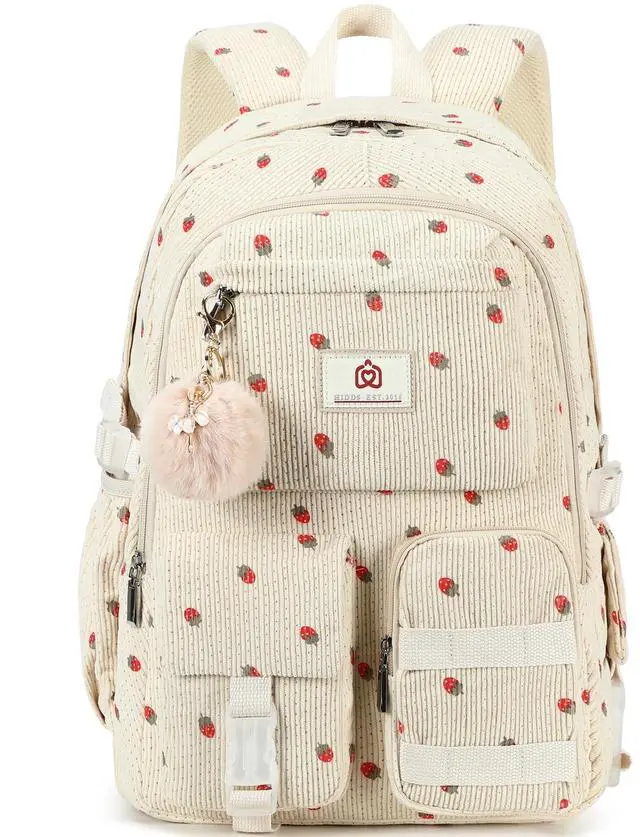 School Backpack for Teens Girls Women 15.6 Inch Laptop College Backpacks Corduroy Work Bag Kids Elementary Middle High Campus Bookbag Students Pack Travel Daypack Womens - Beige Strawberries