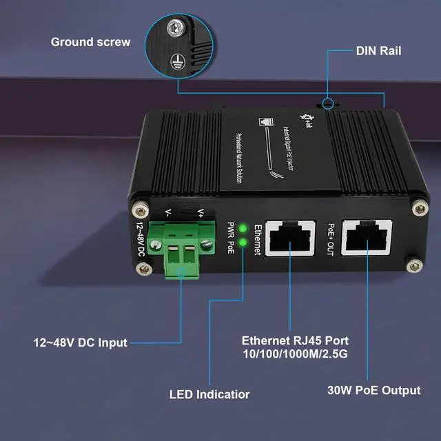 Elenzk 2.5G PoE Injector - Industrial 2.5 Gigabit PoE+ Injector IEEE802.3 at 30W Hardened POE Adapter with 12-48V DC Input DIN- Rail, Wall Mount, Aluminum Metal Housing
