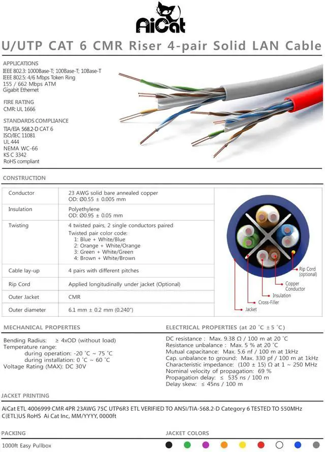 100% CERTIFIED SOLID BARE COPPER CONDUCTOR: Its time to forget Copper Clad Aluminum cables (CCA) With a higher conductivity and tensile strength, Ai Cat. 23AWG Solid Copper Conductors transmit faster while lasting the distance. For heavy traffic networks, and as a solid gaming ethernet cable cat6 - it just makes perfect sense