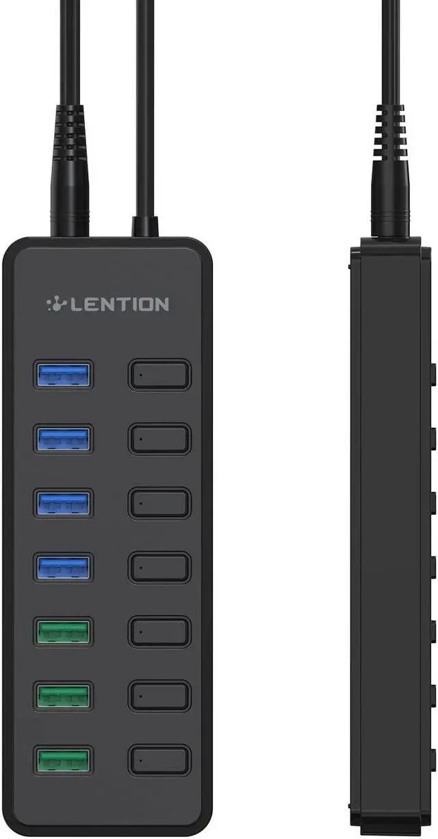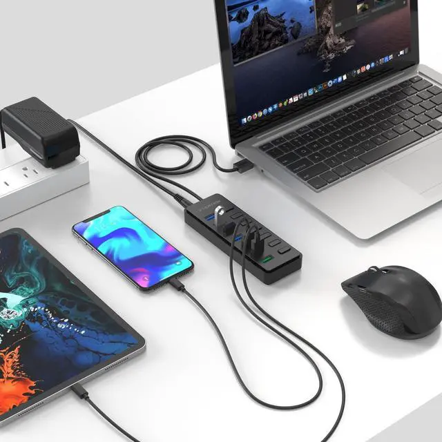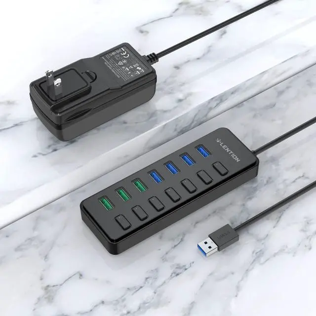 LENTION Powered USB Hub 3.0, 7-Port Data Splitter, 3 Smart Charging, Individual On/Off Switches and 36W Power Adapter for MacBook, Surface, Chromebook, More (CB-H92, Black)