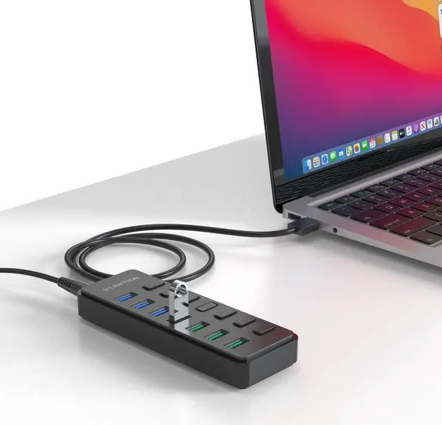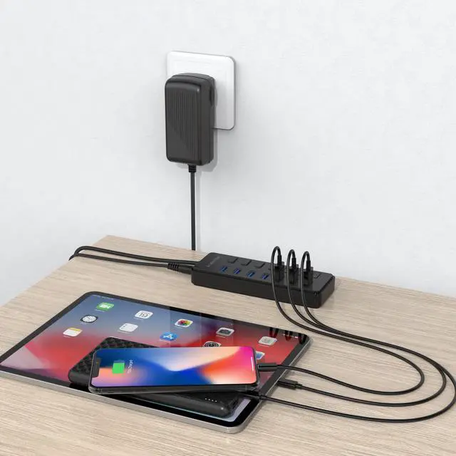 Super speed: 7 ports can work simultaneously and each of them support up to 5Gbps data transfer speed. Each port in the hub have a individual switch and individual LED indicator. It allows you to access and monitor each port separately