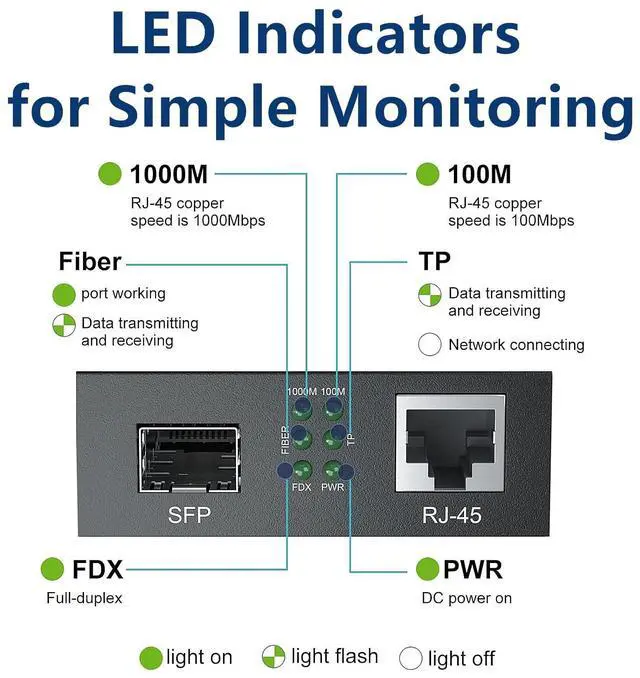Plug and PlayModulization configuration design. plug in optical port and RJ45 port, and it will work immediatelly. Complies with IEEE 802.3, IEEE 802.3u, IEEE802.3z, IEEE802.3ab, IEEE 802.3x. LED indicators for TX, FX LINK/ACT, POWER, FDX to easily monitor network status. Supports jumbo frame size 9K byte. O