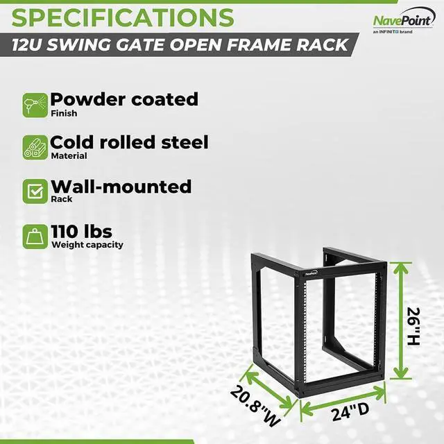 SPECIFICATIONS - The NavePoint 12U network rack is built from 1.5mm cold-rolled steel, finished with black powder coating for durability. Its dimensions are 24"L x 20.8"W x 26"H, designed for standard 19" servers, AV and networking equipment, and it can carry a maximum weight of 110 lbs. The IT rack has a depth of 24 inches.
