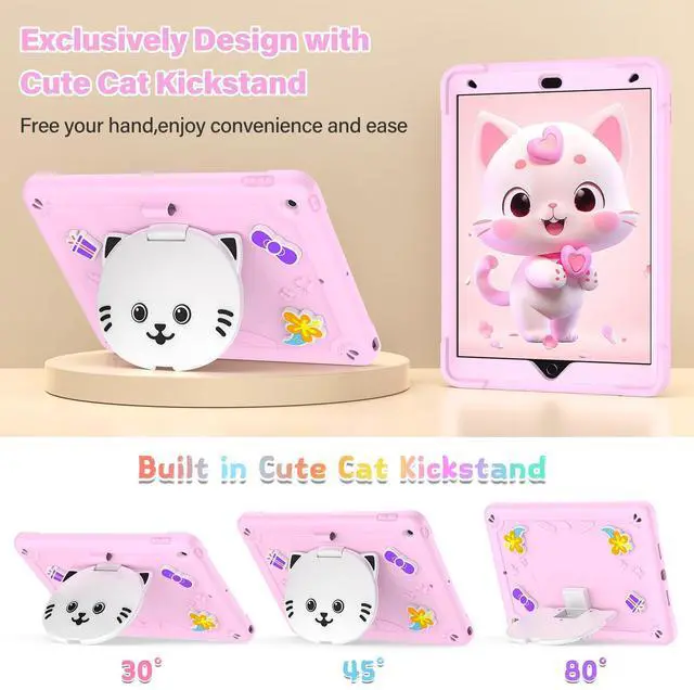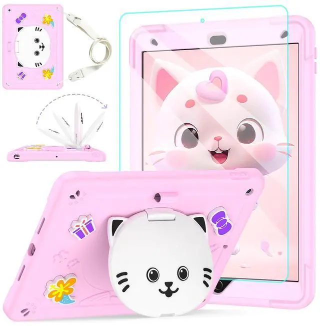 TOMORRY for iPad 9th/8th/7th Generation Case 10.2" with Screen Protector, Cute Cat Stand, Penci Holder Shoulder Strap, Shockproof Protective Case for iPad 10.2 inch 2021/2020/2019 Kids Girls (Pink)