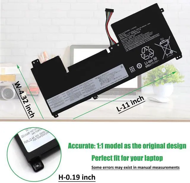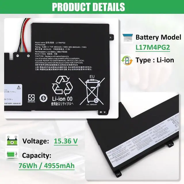 Battery SpecificationModel Name: L17M4PG2; Voltage: 15.36V; Capacity: 76Wh / 4955mAh; Battery Type: Li-ion; Condition: 100% brand new from manufacturer; Color: Black; Packaged come with: 1*battery + battery installation screwdrivers + 1*instruction for laptop battery