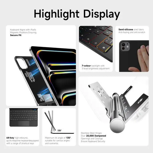 Magnetic Attach: Innovative magnetic attachment design guarantees a secure connection between the keyboard and device, while remaining effortlessly detachable, facilitating seamless transitions or portability.
