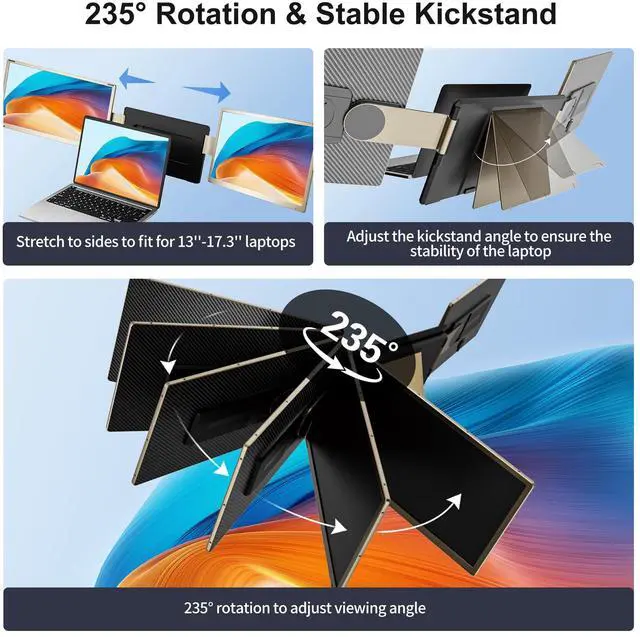 15.6'' Triple Portable Monitor Breakthrough DesignThe three-screen series has been fully upgraded and a number of new features have been added. It can be detached for single-screen use, and both displays are detachable for use as two separate 15.6-inch displays, making it the first detachable triple-screen display on the market. When used as a triple monitor, both monitors can rotate 235 degrees. The screen is equipped with a triangular row bracket, which is stable and firm, and can be adjusted to different angles to improve viewing comfort.Provide different fun experiences for office workers, gamers, stock traders, programmers.