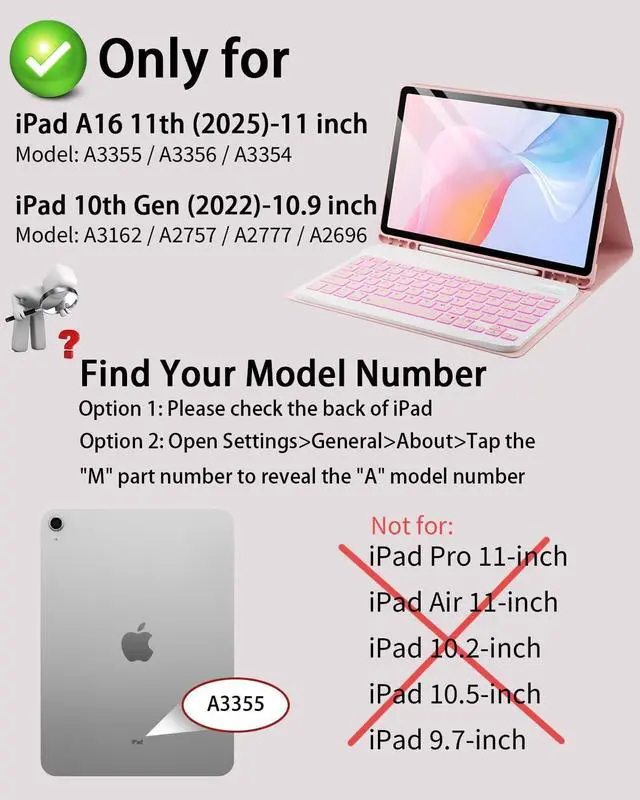 Model CompatibilityDesigned Only for iPad 11th Gen 2025 & iPad 10th Gen 2022 10.9-11 inch, Not compatible with other models. For iPad (A16) 11th generation 11-inch 2025 (Model: A3354/A3355/A3356), For iPad 10th generation 10.9-inch 2022 (Model: A2696/A2757/A2777).You can check the model number before purchasing to make sure you get the correct size tablet keyboard case.