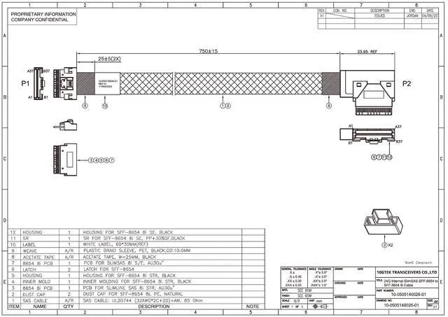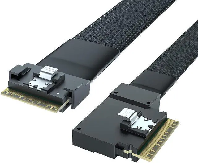 SlimSAS SFF-8654 to SFF-8654 cable, 8i configurations, supports data rates up to 24Gbps, 85 Ohm impedance, 32AWG, (12#) straight to right exit types cable plug.