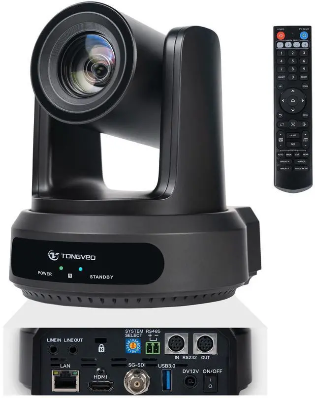 HDMI + SDI + LAN + USB3.0This TONGVEO PTZ Camera has HDMI, SDI, LAN and USB3.0 outputs which can output video simultaneously. LAN supports POE powered and IP control. The Plug & Play HDMI and USB3.0 ports are available to connect to TV/monitor. The SDI port (need a converter) supports remote video transmission up to 328ft/100m. The LINE IN and LINE OUT ports can be used to connect external microphone and speaker devices. Note: NO built-in mic.