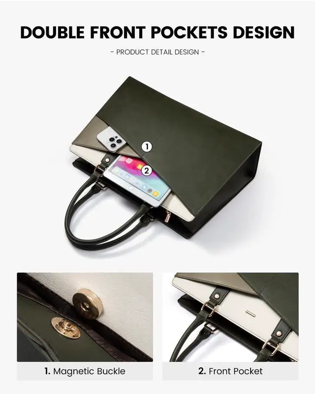 Multi-Compartment DesignThe leather laptop bag has double front magnetic pockets for fetching quickily, one padded laptop&ipad compartment, 2 slip pockets, 2 pen slots, and 1 back anti-theft zipper.Make sure your items are organized.