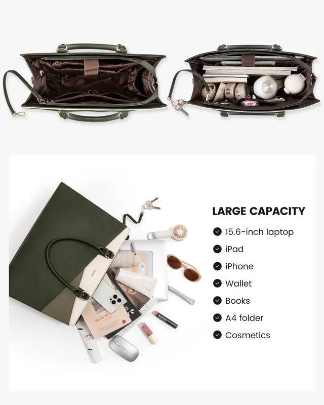 LOVEVOOK Laptop Tote Bag for Women, Leather Business Office Work Bag Computer Briefcase with Small Clutch fit for 15.6 Inch Laptop, Green-Beige-Grey Green