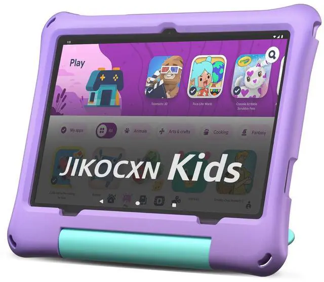 Newest JIKOCXN 10-Inch Kids Tablet With Case - Designed for children aged 6-12, this latest edition JIKOCXN kids tablet features the 2.0 GHz octa-core processor and the faster Android 15 OS that blocks unwanted ads. With 24(4+20) GB RAM, 64GB ROM and 1TB microSD expandable storage (card not included), children enjoy seamless learning and entertainment.