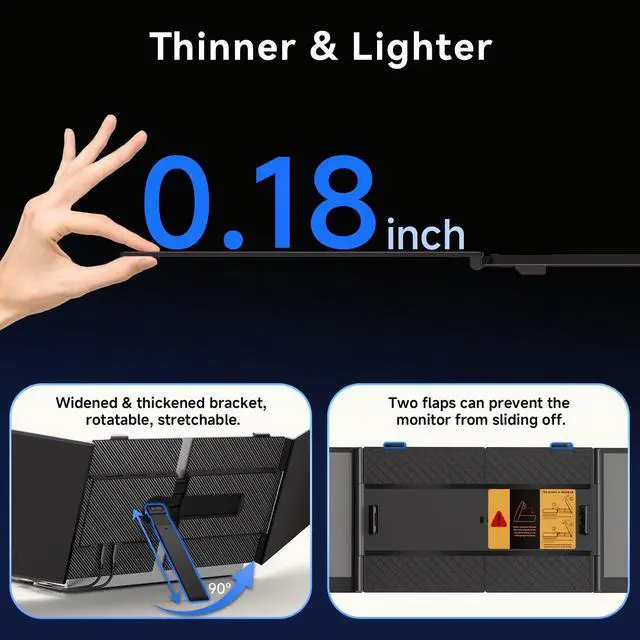 Ultra Thin & LightweightGet ready to experience a game-changing level of portability.At a mere 4.6mm thin and weighing just 2.65lb, this laptop screen extender is significantly lighter (30% less than traditional triple-screen setups tipping the scales at 3.6lb). It is tailored for 15-17.3" laptops to enjoy a comfort extended view world.