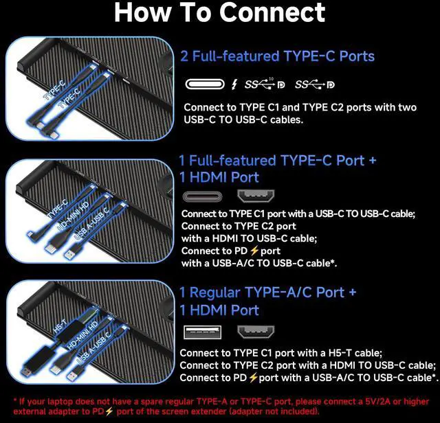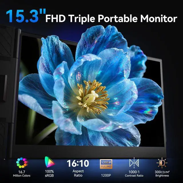 Stunning 1200P FHD DisplayDive into a world of vibrant colors and razor-sharp details on a premium 15.3" IPS panel on our tri laptop monitor extender. Boasting a resolution of 1920x1080 Full HD, 300 nits brightness, 16.7 million colors and contrast ratio of 1000:1, this monitor offers breathtaking visual clarity.Ideal for professionals workers, students, and digital creators looking for an immersive viewing experience.