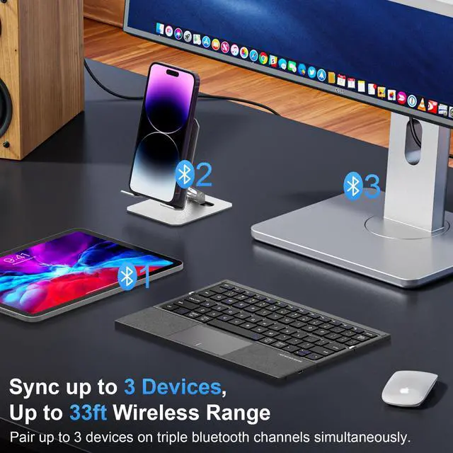 Triple-Connect Bluetooth Keyboard: The wireless keyboard features Bluetooth 5.1 technology, allowing you to pair up to 3 devices simultaneously on three Bluetooth channels and easily switch between them with the push of a button. With a stable connection range of up to 33 feet, it is compatible with Windows, Mac OS, iOS or Android devices and connects smoothly with your iPad, iPhone, mobile phone, tablet or laptop.
