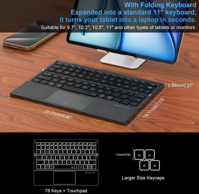 Full Size Folding Keyboard: A true full-size laptop keyboard with 78 keys + trackpad + a full row of shortcuts, 12 shortcuts for instant access to homepage, switching apps, volume and more. Press Fn+ESC to ac