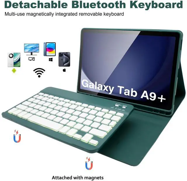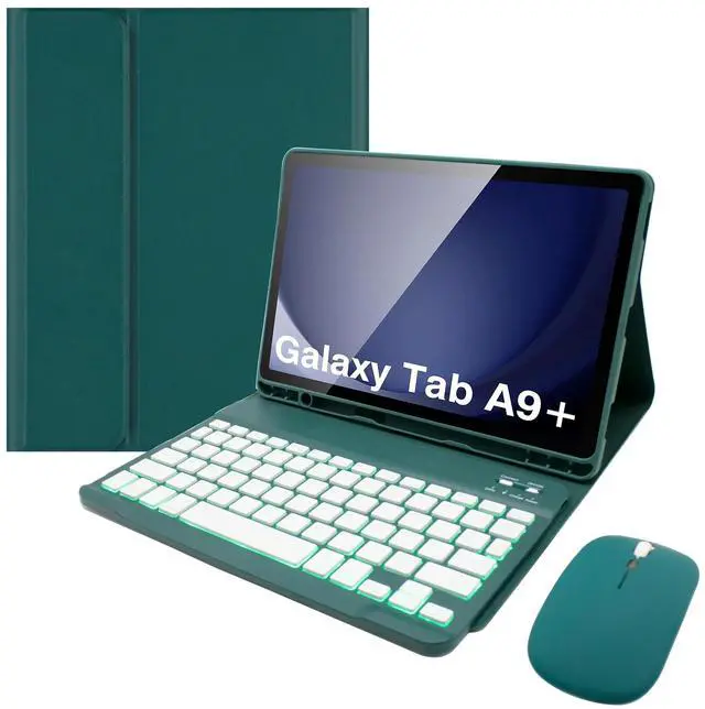 Keyboard Case for Samsung Galaxy Tab A9 Plus 11 Inch - 7 Colors Backlit Wireless Detachable Folio Keyboard Cover with Pencil Holder, Bluetooth Mouse for Tablet A9+,Dark Green