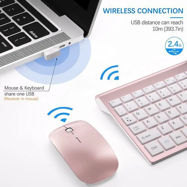 Stable 2.4G Wireless ConnectionPowerful and reliable connection of wireless keyboard mouse is up to 10 m(393.7in). Wireless keyboard with mouse combo share a Nano receiver (stored at the bottom of the mouse) without installing any additional software, plug and play. Keep your desk clean and tidy.