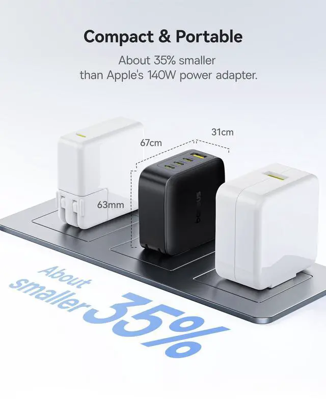 • Compact & Portable: This portable charger is approximately 35% smaller than Apple's 140W power adapter. It's extremely convenient for everyday carry and travel. The foldable prongs make sure that it won't scratch your bag or items inside and it won't take up much space in your backpack, luggage, or pocket.