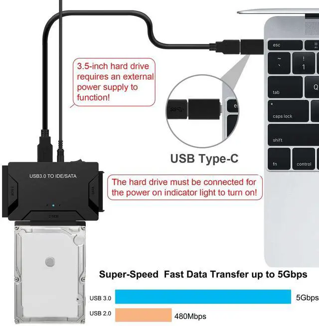 SUPERSPEED UP TO 5Gbps with USAP: IDE hard drive reader supports a data transfer rate of up to 5 Gbps and supports UASP. which is 70% Faster than traditional USB 3.0 and 40% reduction in required processor resources, Backward compatible with USB 2.0 / 1.1