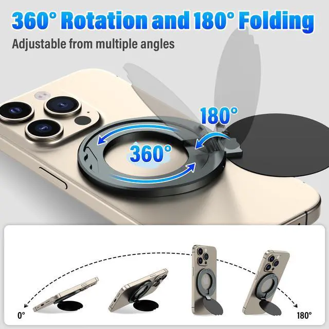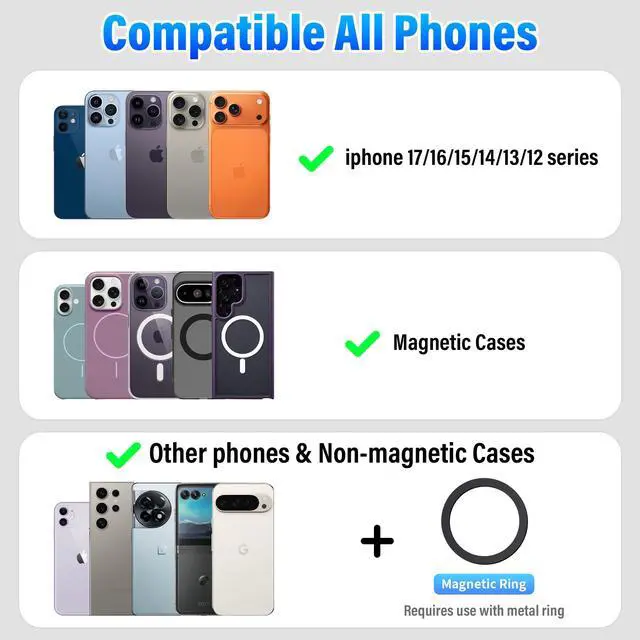 : This magsafe phone stand is directly compatible with iPhone 17/16/15/14/13/12 series and MagSafe phone cases. We also comes with a magnetic ring that provides the same strong magnetic fixation function for Non-MagSafe phones