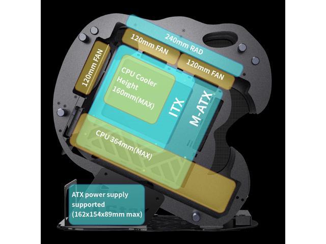 Compatibility Supports up to 364x76x155mm GPU, 162*154*89mm(max) ATX PSU , 2.5" SSD, heat sinks up to 240mm water radiators or dual 120mm ARGB fans on top, USB-C ready and plus a rear 120mm