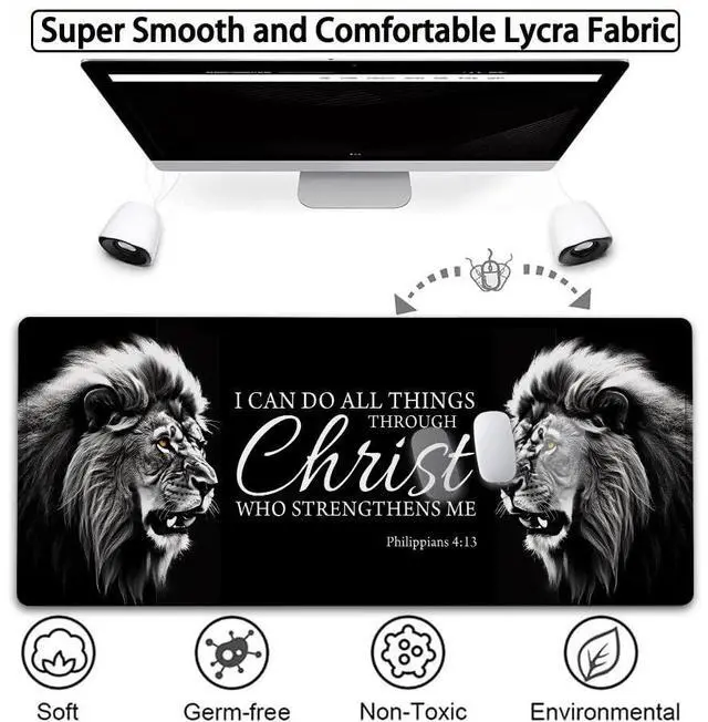 Large Gaming Mouse Pad,31.5x11.8in Extended Computer Mouse Mat with Non-Slip PU Base, Ergonomic Memory Foam Keyboard Wrist Rest, for Work Gaming, Fierce Lion Philippians 4:13 Black Office Desk Pad