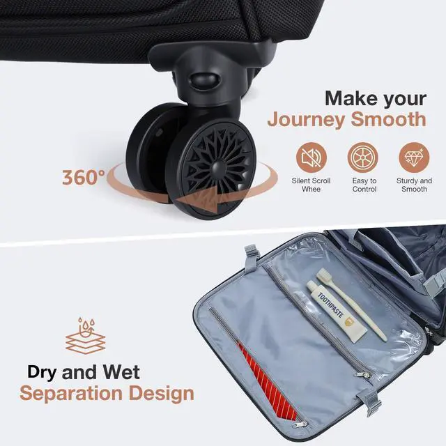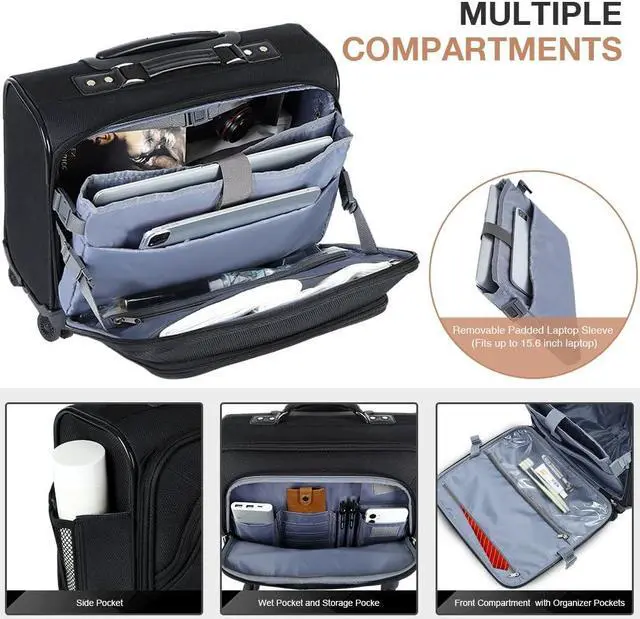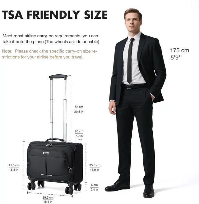 Aircraft-certified Size: The dimensions of this rolling laptop bag are 41.5X39.5X20CM, suitable for most airlines' overhead compartments and meet the size requirements for carry-on luggage. It is compatible with under-seat storage. The rolling computer bags is an ideal choice for business men and women traveling on business trips