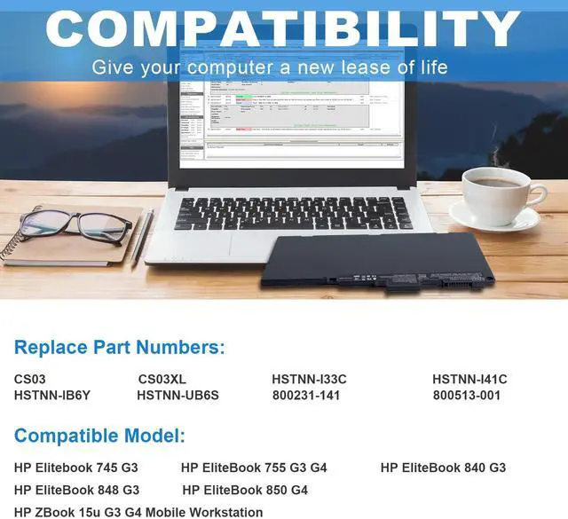 • Compatible ModelCS03XL Battery for HP Elitebook 745 G3 745 G4 755 G3 755 G4 840 G3 840 G4 850 G3 850 G4 ZBook 15u G3 Mobile Workstation.