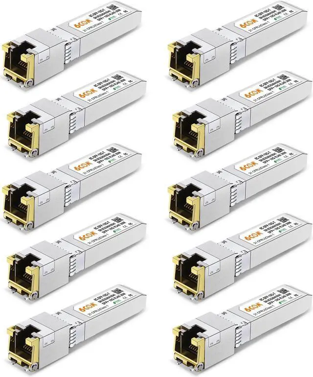 10Pack 10GBase-T SFP+ TransceiverSupport 10Gb/s data rate, fit for CAT6A/CAT7 cable, copper RJ-45 connector, reach up to 30m.