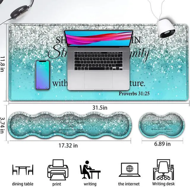Gaming Mouse Pad, Large Mouse Pad with Stitched Edge, Non-Slip Base Office Desk Pad Ergonomic Keyboard Wrist Rest Set, Waterproof Writing Pad, Proverbs 3125 Bible Blue Glitter Extended Desk Mat