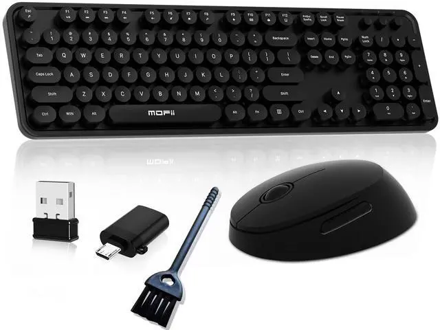 RETRO WIRELESS KEYBOARD AND MOUSE SET This typewriter keyboard features a vintage design with iconic round keycaps. The wireless keyboard and mouse combo is reliable and ideal for home, office, or college. Free replacement for damaged receiver