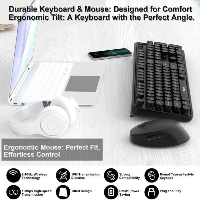 FADE-RESISTANT KEYS & RELIABLE CONNECTION This retro keyboard and mouse wireless set features fade-resistant keycaps and a stable 2.4GHz wireless connection up to 33 feet. The plug-and-play design allows quick, driver-free setup