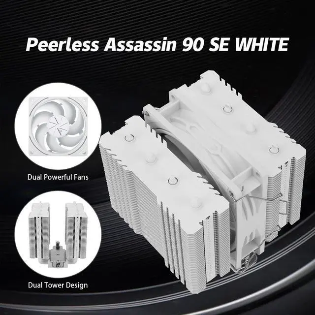 [Product Specifications ] Cooler Model: Peerless Assassin 90 SE White, CPU cooler dimensions: 94 (L) x 94 (W) x 110 (H) mm; all-aluminium aluminium fins with a pure copper base and 4 AGHP technology heatpipes, assisted by the TF4 and the fan's 2200 high RPM, to improve the overall CPU cooling performance.