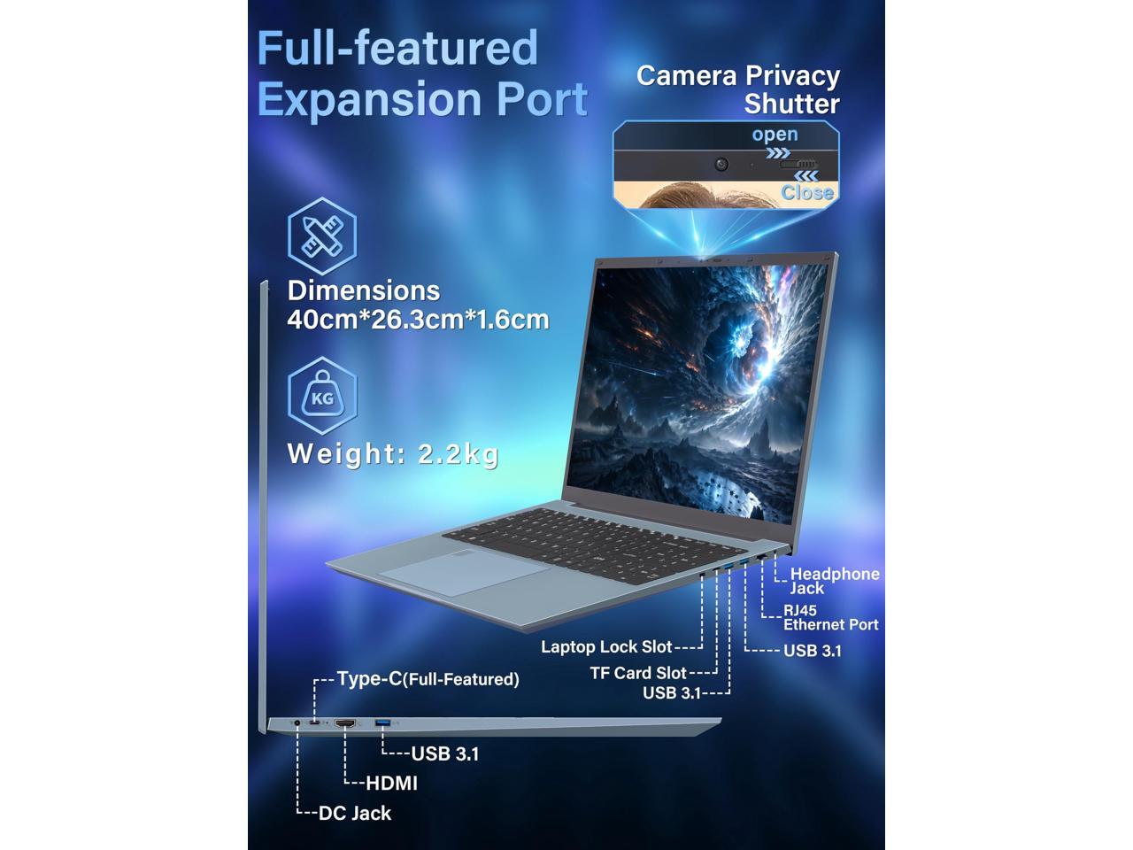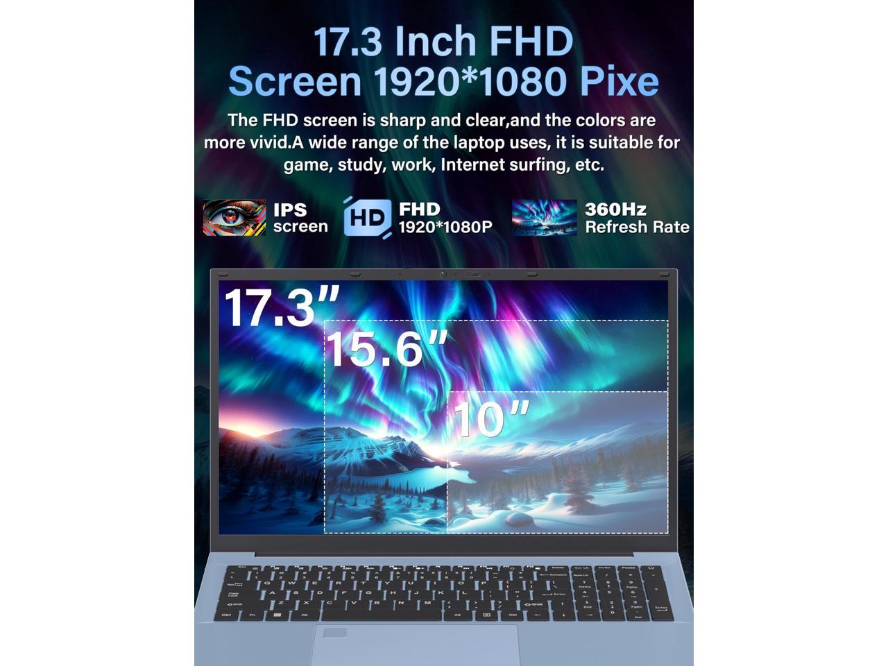 - Expansive 17.3-Inch FHD IPS Display Immerse yourself in the brilliance of a large 17.3" 1920x1080 resolution screen, featuring an IPS panel for vivid colors and sharp details from any angle. The 85% screen-to-body ratio combined with the 16:9 aspect ratio and narrow bezelsl design maximizes the screen area, providing an expansive viewing experience in a sleek form. Whether you're tackling detailed tasks or enjoying your favorite entertainment, this display is designed to deliver both size and clarity, transforming how you see and do everything
