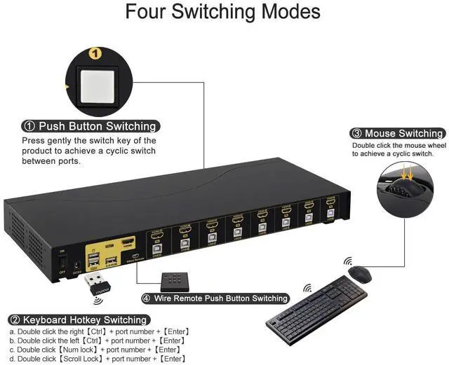 3. 8 Port USB KVM Switch: Four switching way optional: Hotkey switching(Num Lock + Num Lock + 1 / 2 / 3 ... + Enter, or Ctrl + Ctrl + 1 / 2 /3 ... + Enter, or Scroll Lock+ Scroll Lock+1 / 2 / 3 ... + Enter), mouse switching (click mouse wheel 2 times + left button/right button), manual button switching, wired remote push button switching.