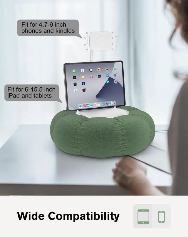 Dual-Support Design: This Kindle pillow stand features a silicone strap holder for phones (4.7"-8") and Kindle, while the two supporting points on the plush pillow are specifically designed for iPads and larger tablets (8"-16.5"), Perfect as a Kindle stand for reading in bed and an iPad stand for bed, it offers optimal stability and comfort for various devices.