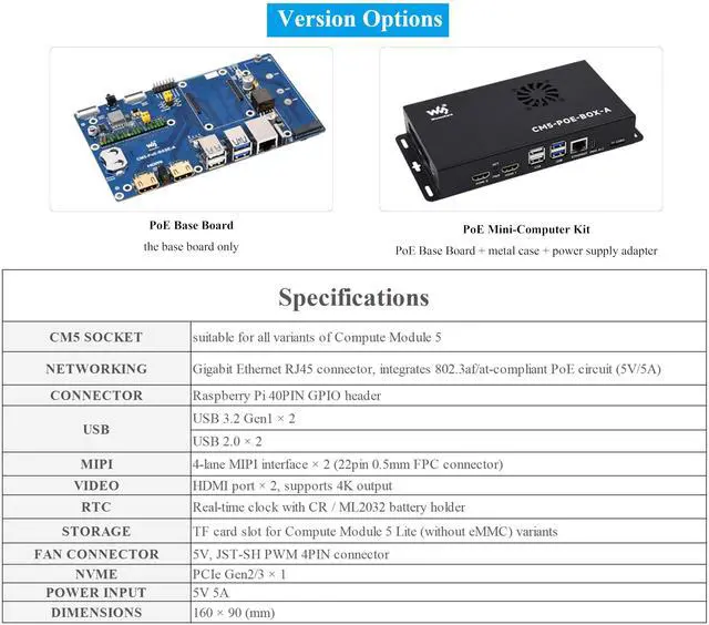 Compute Module 5 PoE Base Board, CM5 IO Board with PoE Feature, Support POE and Type C Power Supply/M.2 NVMe Solid State Drive 2280 2260 2242 2230, Onboard MIPI/M.2/HDMI/USB/ETH/TF Card Slot