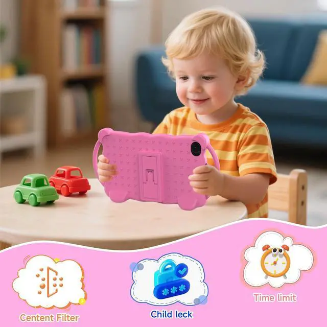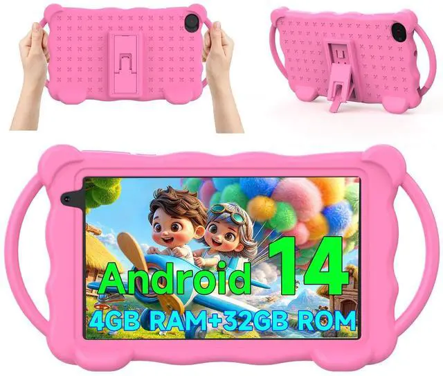 Vyrolinia Kids Tablet 7 inch Android 14.0 for Toddler, 4GB RAM 32GB ROM Bluetooth IPS Screen Google Play YouTube Parental Control Dual Camera Shockproof Case for Educational Games (Pink)