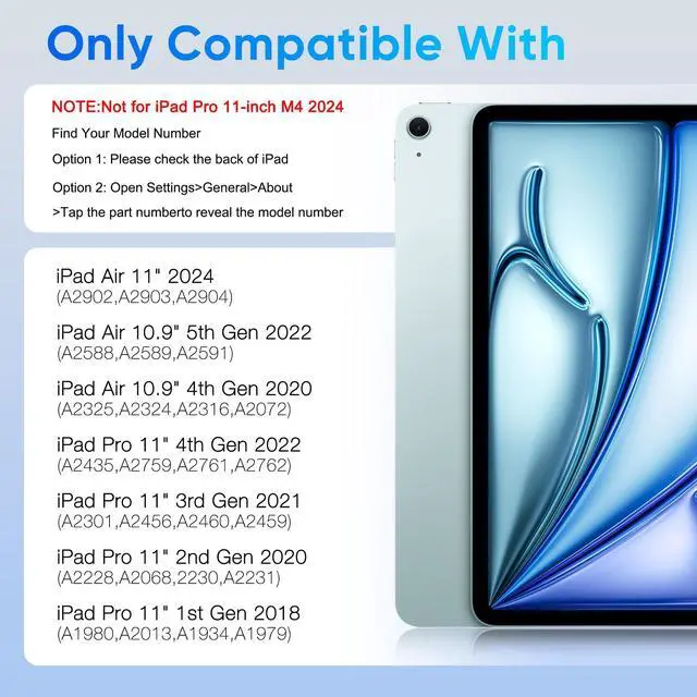 Compatibility - This touchpad keyboard case is perfectly compatible with iPad Air 11-inch (M3 2025 / M2 2024) & iPad Pro 11-inch 4th/3rd/2nd/1st gen(2018-2022),iPad Air 5th/4th gen.Models include Air 11-inch (M3) 2025 (A3266, A3267, A3270),Air 11-inch (M2) 2024 (A2902,A2903,A2904), 2022 Pro 11 4th Gen (A2759,A2435,A2761,A2762),2021 Pro 11 3rd Gen (A2377,A2301,A2459,A2460),2020 Pro 11 2nd Gen (A2228,A2068,A2230,A2231),2018 Pro 11 1st Gen(A1980,A2013,A1934,A1979),2022 10.9-inch Air 5th GenA2588,A2589,A2591),Air 4th Gen (A2072,A2316,A2324,A2325).
