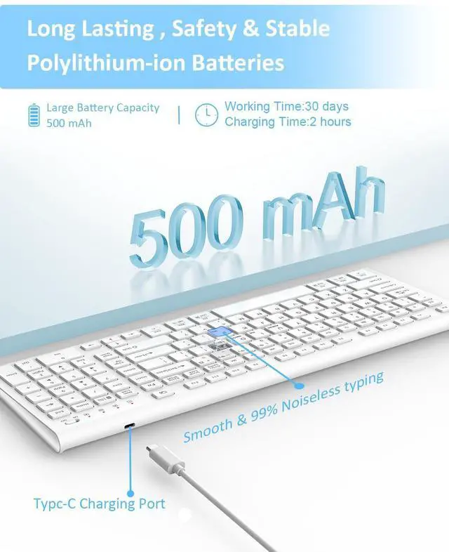 FENIFOX Wireless Keyboard, Bluetooth + USB Ergonomic Silent Quiet Rechargeable with Number Pad Compact Full Size Multi Device Keyboards for iPad Tablet Mac Computer Surface PC MacBook Laptop White