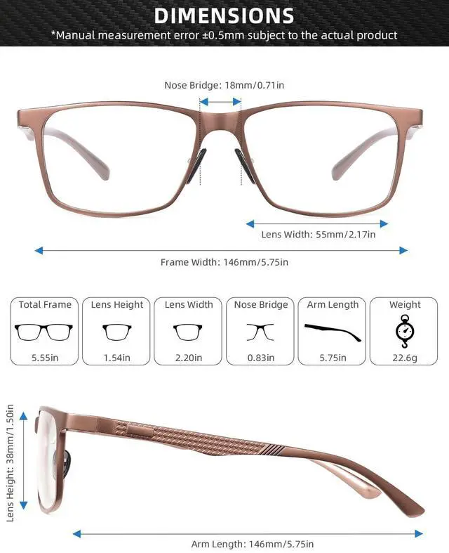 Flexible Spring Hinge DesignDurable lightweight frame with adjustable spring hinge, suitable for long-term wearing and very comfortable, fit most face shapes.