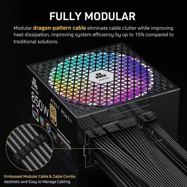 Fully Modular PSU: This reliable and efficient power supply is equipped with fully modular dragon-patterned cables. It can eliminate cable clutter, optimize air flow, and improve the overall efficiency and thermal performance of the machine.